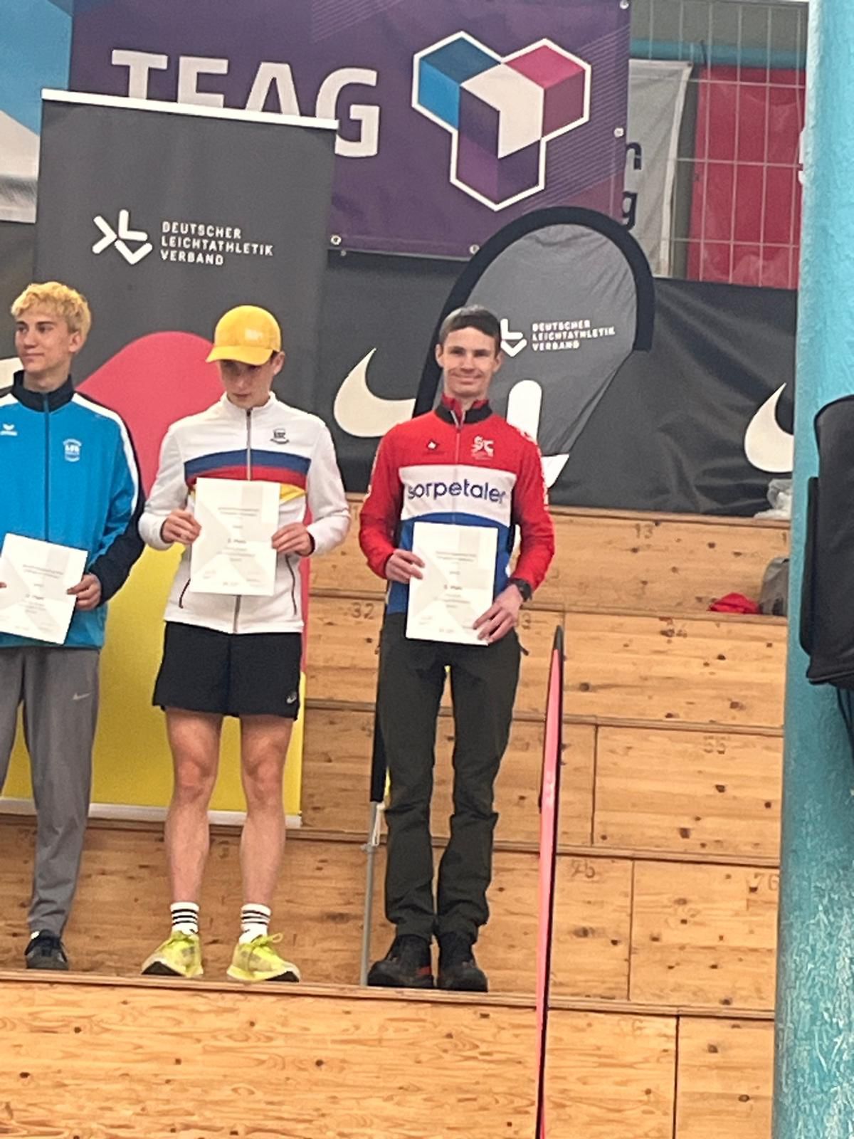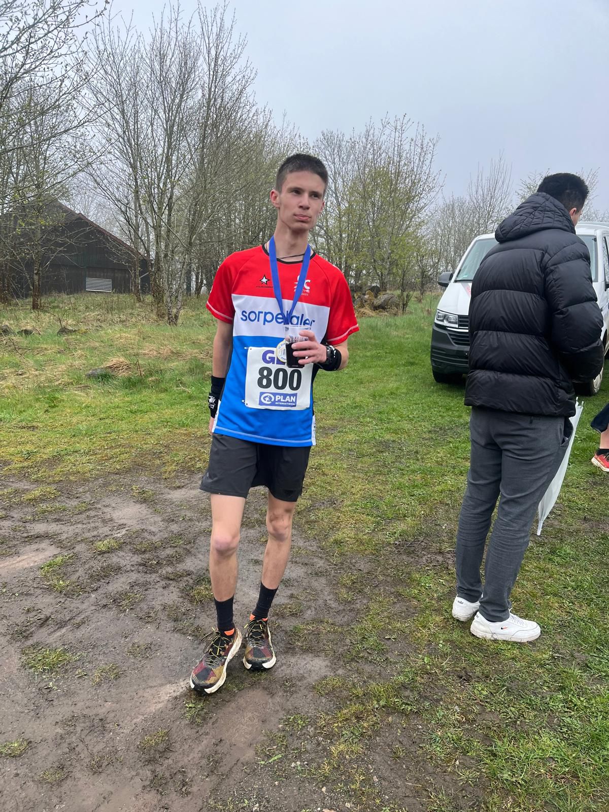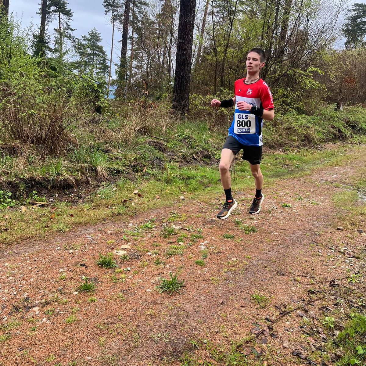 Bei der Anreise am Samstag schien noch die Sonne aber am Sonntag war das Wetter alles andere als gut. Dauerregen und Gewitter machten einen pünktlichen Start unmöglich, so dass der Start um 30 Minuten nach hinten verschoben wurde. Bei den diesjährigen Deutschen Meisterschaften ging es 7,3 km mit 437 Höhenmetern den Berg Pleß hoch. Silas war in guter Form und konnte die Startverzögerung mental gut wegstecken, so konnte er sofort mit der Führungsgruppe mitlaufen. Nach einer starken Leistung und einem 500 m langen Endspurt zum Ziel kam er als gesamt 7. und in der Altersklasse als 6. ins Ziel.